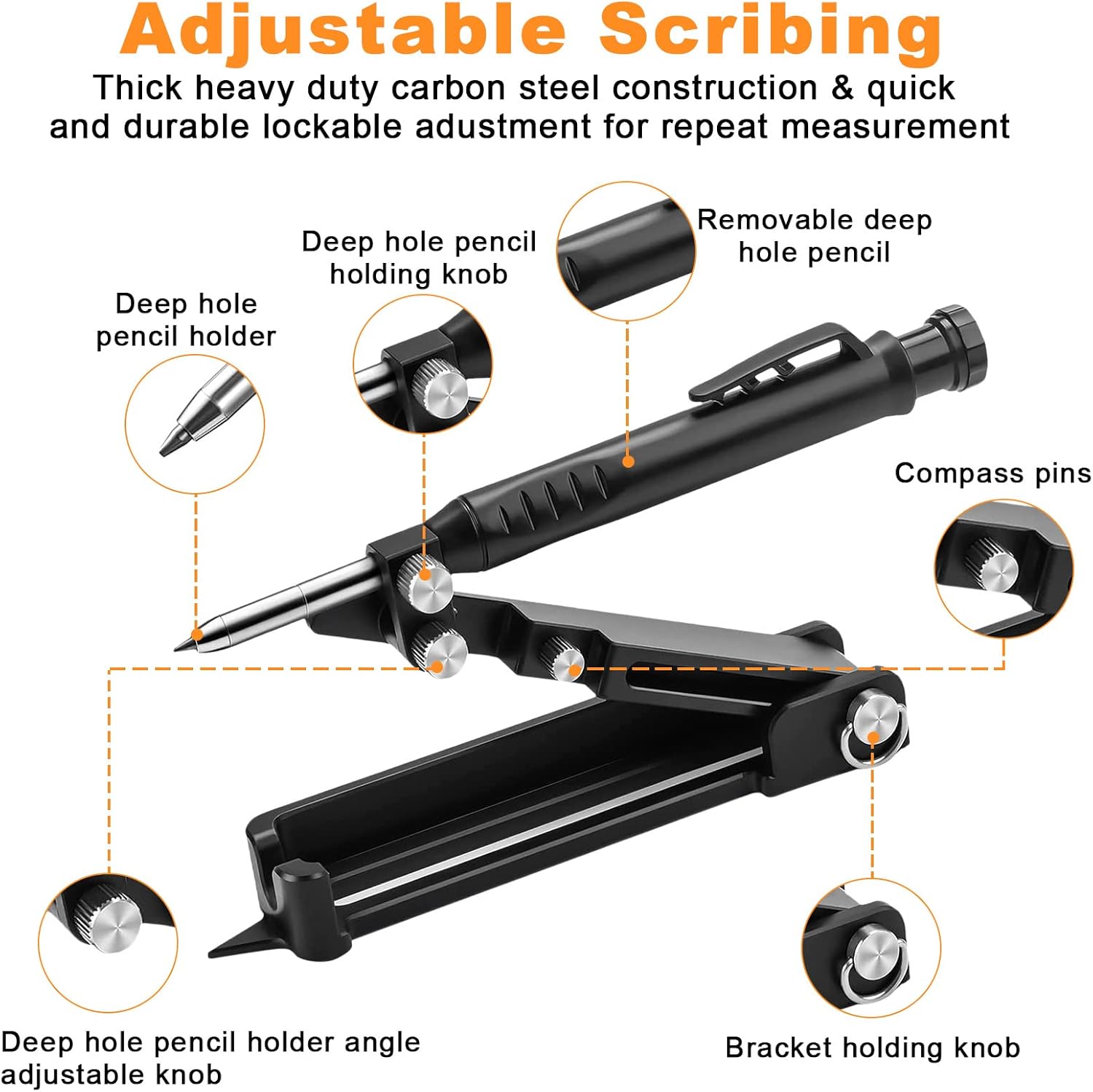 Versatile scribing tool made of anodized premium aluminum alloy Not only lightweight and portable, but also has more than 15 marking applications Scribing countertops, installing baseboards, floors, laminating tiles, decorative woodworking, laminating cabinets, under-stair storage, leaning Window seats, wall panels, custom carpentry installations, other remodeling and renovation work.